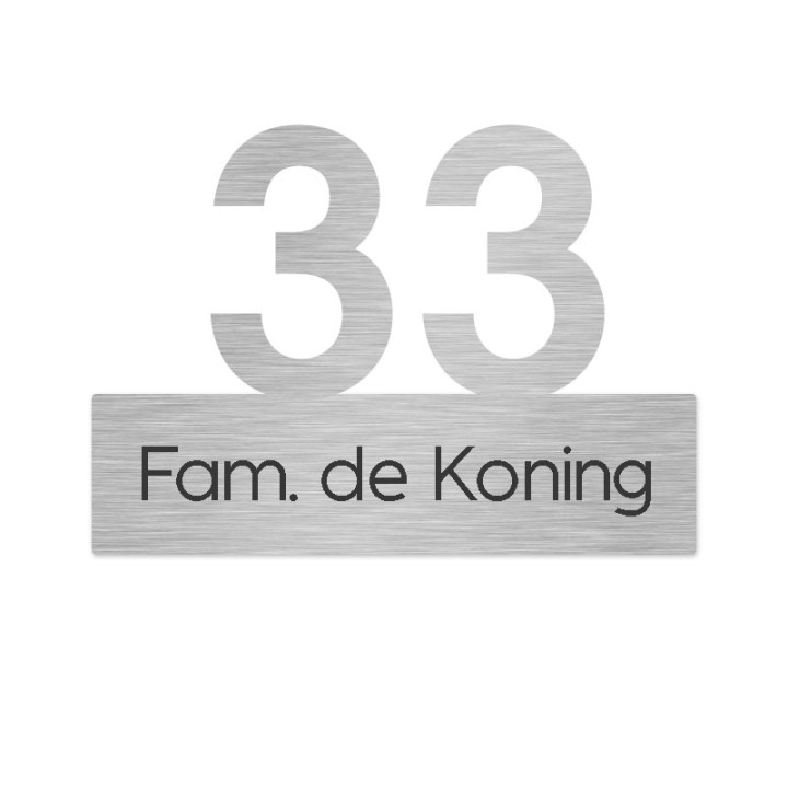Dit unieke RVS bordje is voorzien van een lasergesneden huisnummer én een naamplaatje. De tekst op het onderste plaatje graveren wij er met onze lasermachine in.