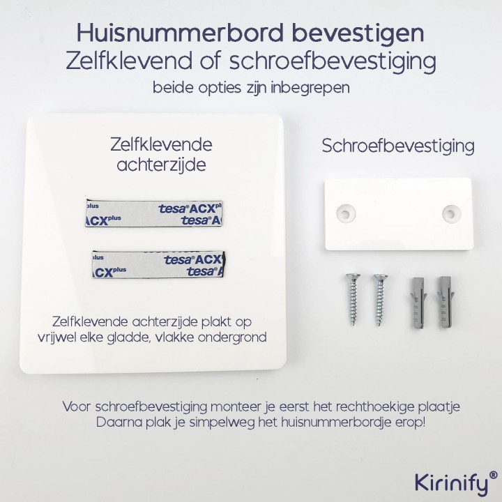 - Is plakken geen optie? Dan zal er geboord moeten worden. Meegeleverd is een montageplaatje dat je met twee schroeven kunt vastzetten. Hier kun je vervolgens het huisnummerbordje op plakken zodat deze zonder zichtbare schroeven aan de gevel vast zit.