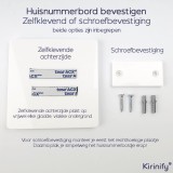 - De achterzijde van het huisnummerbordje is voorzien van twee zelfklevende strips. Je kunt het bordje direct op een gladde ondergrond plakken, bijvoorbeeld een deur, garagepoort e.d.